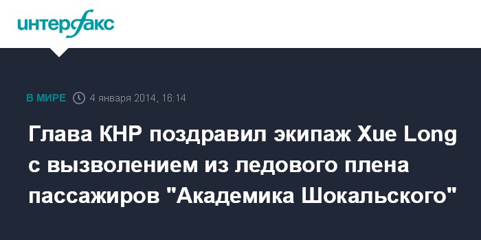 Москва. 4 января. INTERFAX.RU - Председатель КНР Си Цзиньпин поздравил членов команды китайского ледокола Xue Long ("Снежный дракон") с успешно проведенной операцией по освобождению пассажиров российского научного судна "Академик Шокальский", сообщают в субботу местные СМИ. "Вы прославили Китай и наш народ", - говорится в послании Си Цзиньпина.