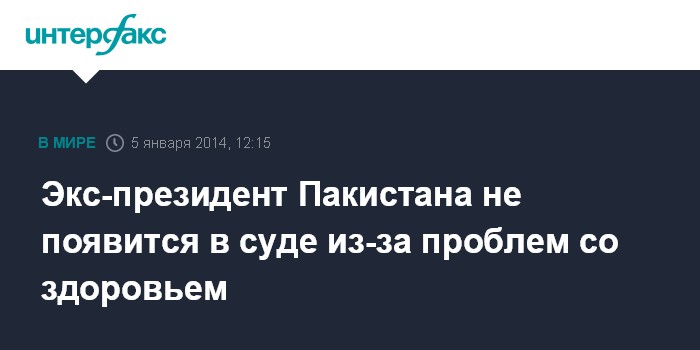 Москва. 5 января. INTERFAX.RU - Бывший пакистанский президент Первез Мушарраф не сможет прибыть на судебные слушания, назначенные на понедельник, ввиду проблем с сердцем, сообщил в воскресенье индийский телеканал NDTV со ссылкой на его адвоката Ахмеда Разы Касури.