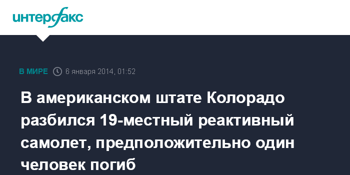 В американском штате Колорадо разбился 19-местный реактивный самолет, предположительно один человек погиб