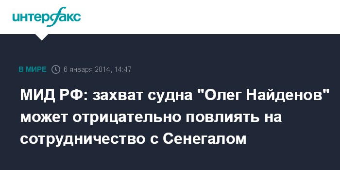 Москва. 6 января. INTERFAX.RU - Захват сенегальскими военными рыболовецкого судна "Олег Найденов" в исключительной экономической зоне Гвинеи-Биссау может отрицательно повлиять на российско-сенегальское сотрудничество, считают в МИД РФ. "Российская сторона выражает серьезную озабоченность произошедшим инцидентом, способным отрицательно повлиять на российско-сенегальское сотрудничество, и просит незамедлительно освободить российское судно", - говорится в ноте российского иностранного ведомства, полученной Росрыболовством.