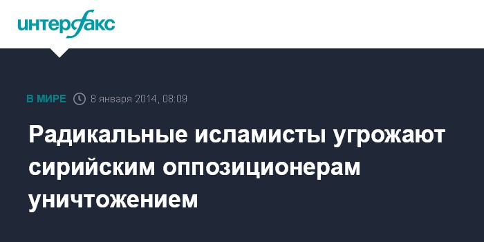 Дубай. 8 января. ИНТЕРФАКС - Радикальная исламистская группировка "Исламское государство Ирака и Леванта" (ИГИЛ) распространила заявление, в котором угрожает уничтожением сирийским оппозиционерам, представляющим Национальную коалицию сирийских революционных и оппозиционных сил (НКСРОС) и Сирийскую свободную армию.