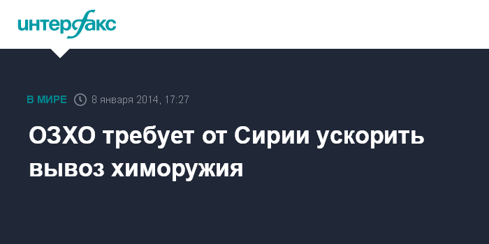 Лондон. 8 января. ИНТЕРФАКС - Организация по запрещению химического оружия (ОЗХО) считает, что сирийские власти должны приложить усилия к ускорению вывоза химического оружия из страны.