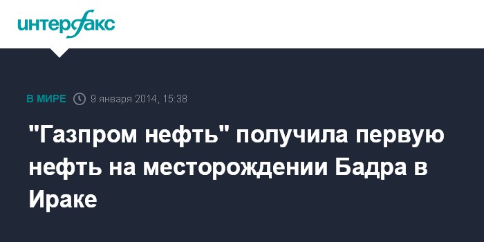 Москва. 9 января. INTERFAX.RU - "Газпром нефть" (MOEX: SIBN) получила первую нефть на месторождении Бадра в Ираке, где российская компания выступает оператором в составе консорциума.