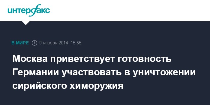 Москва. 9 января. INTERFAX.RU - В Москве приветствуют готовность Германии участвовать в уничтожении отходов, остающихся после ликвидации сирийского химического оружия, заявил "Интерфаксу" источник в российском дипведомстве.