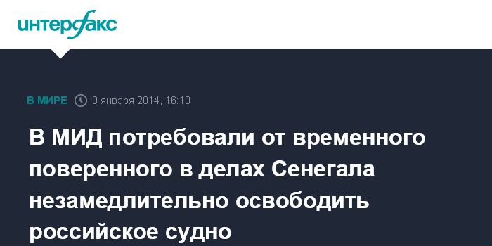 Москва. 9 января. INTERFAX.RU - В ходе беседы российских дипломатов с временным поверенным в делах Сенегала в Москве Мамаду Дианем в МИД России российская сторона вновь потребовала немедленного освобождения траулера "Олег Найденов" и его экипажа, заявил официальный представитель МИД России Александр Лукашевич.