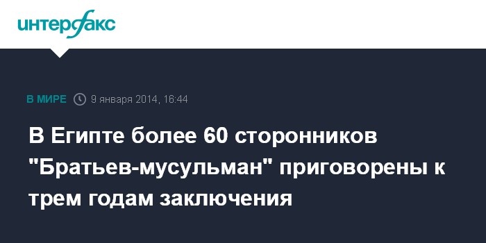 Москва. 9 января. INTERFAX.RU - Египетский суд в четверг приговорил 63 сторонников движения "Братья-мусульмане" к трем годам заключения каждого, сообщают западные СМИ.