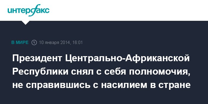 Вашингтон. 10 января. INTERFAX.RU - Президент Центрально-Африканской Республики (ЦАР) Мишель Джотодиа уходит в отставку из-за неспособности справиться с эскалацией насилия в стране.