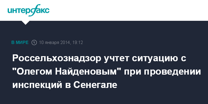 Москва. 10 января. INTERFAX.RU - Россельхознадзор будет принимать решения об инспектировании рыбоперерабатывающих предприятий Сенегала с учетом ситуации вокруг российского траулера "Олег Найденов".