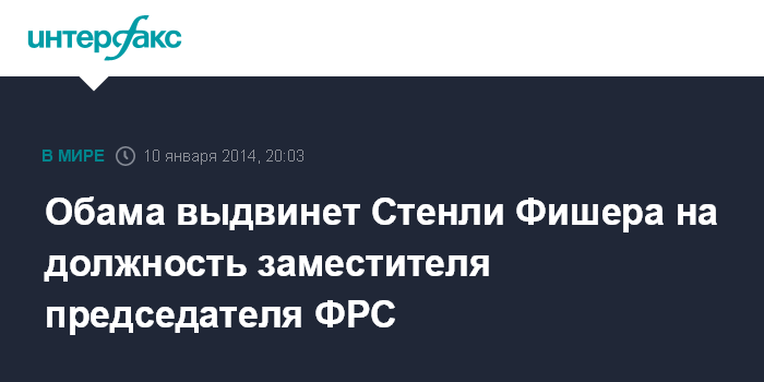 Вашингтон. 10 января. INTERFAX.RU - Президент США Барак Обама выдвинет Стенли Фишера, одного из самых известных в мире экономистов, на пост заместителя председателя Федеральной резервной системы (ФРС), сообщает агентство Bloomberg со ссылкой на официальное заявление Белого дома.