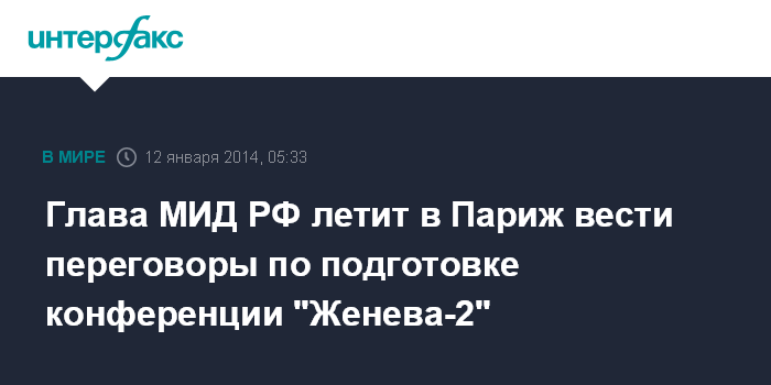 Москва. 12 января. INTERFAX.RU - Участие Ирана в международной конференции по Сирии, а также формирование делегации сирийской оппозиции для участия в предстоящем мероприятии, как ожидается, станут главными темами переговоров главы МИД РФ Сергея Лаврова в ходе его визита в Париж 12-13 января.
