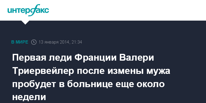 Первая леди Франции была госпитализирована в пятницу через несколько часов после того как французский еженедельный журнал Closer опубликовал материал о связи лидера страны Франсуа Олланда с известной французской актрисой Жюли Гайе, отмечает в свою очередь французское издание "Нувель обсерватер". Кроме того, как стало известно, Олланд лично признался супруге в неверности, что стало для Триервейлер "огромным эмоциональным шоком".