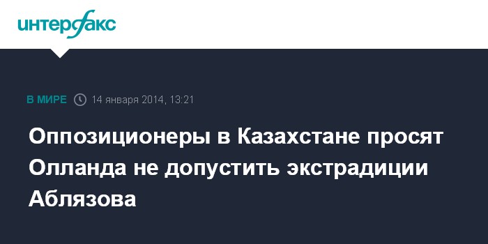 Москва. 14 января. INTERFAX.RU - Группа оппозиционно настроенных граждан Казахстана во вторник в Алматы передала в генеральное консульство Франции обращение, адресованное президенту этой страны Франсуа Олланду, в котором просит не экстрадировать задержанного бывшего председателя совета директоров БТА Банка Мухтара Аблязова в Россию или на Украину.