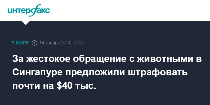 По сообщению The Jakarta Globe, новый штраф для живодеров составит $39 530. Законопроект будет представлен на рассмотрение в ближайшее время, отметил Шанмугам.