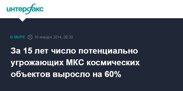 Москва. 16 января. INTERFAX.RU - По состоянию на октябрь 2013 года число потенциально угрожающих Международной космической станции (МКС) космических объектов, находящихся на высотах 415 - 420 км, превысило 800, сообщается в специализированном ежеквартальном отчете NASA.