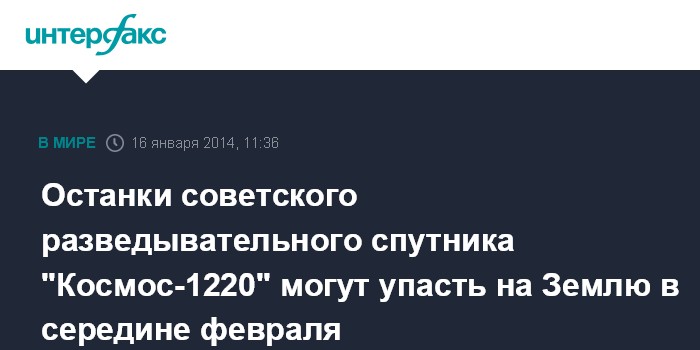Москва. 16 января. INTERFAX.RU - Большой фрагмент советского спутника морской разведки типа УС-П "Космос-1220" прекратит баллистическое существование в период с 12 по 25 февраля, сообщили в четверг "Интерфаксу" в информационно-аналитическом центре межгосударственной акционерной корпорации (МАК) "Вымпел" (входит в концерн ПВО "Алмаз-Антей").
