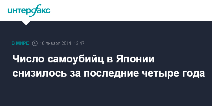 Москва. 16 января. INTERFAX.RU - В 2013 году число людей, решивших покончить жизнь самоубийством, упало на 2,4% по сравнению с предыдущим годом, что свидетельствует о снижении количества суицидов четвертый год подряд, сообщает в четверг веб-сайт японской газеты Mainichi Shimbun.