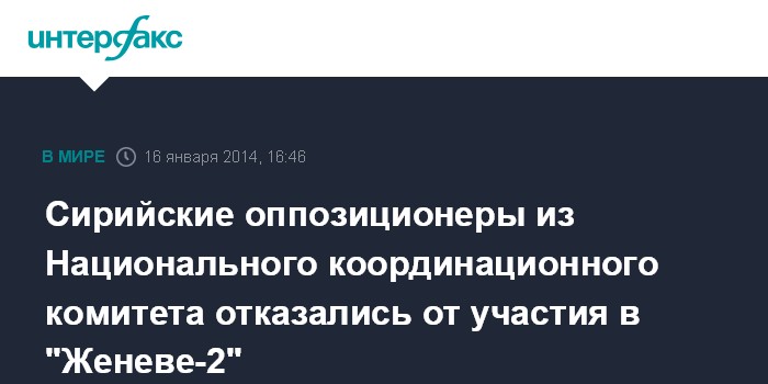 Дубай. 16 января. INTERFAX.RU - Оппозиционный сирийский Национальный координационный комитет принял решение не участвовать в конференции "Женева-2", цитирует в четверг межарабская газета "Аш-Шарк аль-Аусат" слова международного посредника по сирийскому урегулированию Лахдара Брахими.