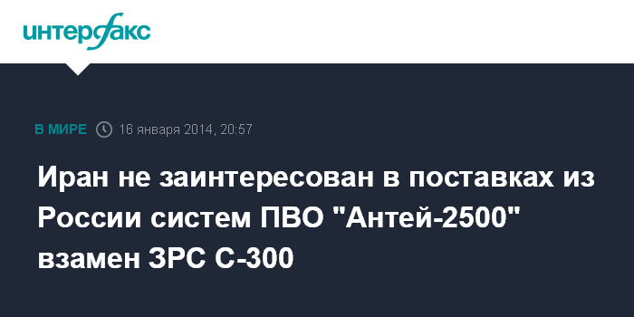 Москва. 16 января. INTERFAX.RU - Глава МИД Ирана Джавад Зариф опроверг информацию о якобы заинтересованности Тегерана в приобретении российских систем противовоздушной обороны "Антей-2500" вместо неполученных зенитно-ракетных комплексов С-300.