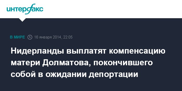 Брюссель. 16 января. INTERFAX.RU - Нидерланды согласились на выплату компенсации матери российского диссидента Александра Долматова, который покончил собой в нидерландской тюрьме в ожидании депортации на родину.