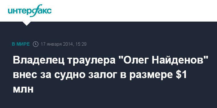 Москва. 17 января. INTERFAX.RU - Владелец траулера "Олег Найденов", задержанного властями Сенегала, внес за судно залог в размере около $1 млн, сообщил "Интерфаксу" руководитель центра общественных связей Росрыболовства Александр Савельев.
