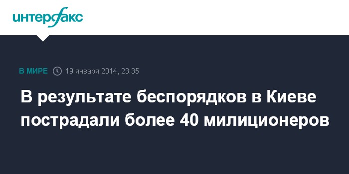 Москва. 19 января. INTERFAX.RU - Более 40 правоохранителей пострадали во время событий в центре Киева, около 30 из них госпитализированы, сообщает управление связей с общественностью МВД Украины.