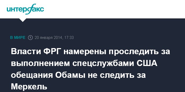Берлин. 20 января. INTERFAX.RU - Правительство Германии продолжит переговоры с властями США по вопросу прекращения слежки за немецкими чиновниками, сообщает в понедельник агентство ЭФЭ со ссылкой на представителя канцлера ФРГ Штеффена Зайберта.