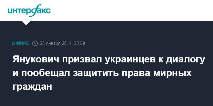Киев. 20 января. INTERFAX.RU - Президент Украины Виктор Янукович обратился к соотечественникам с призывом к диалогу и компромиссу, заверив со своей стороны сделать все возможное для обеспечения общественного порядка.