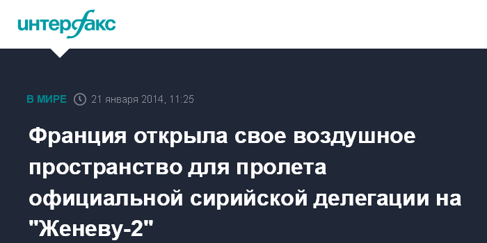 Москва. 21 января. INTERFAX.RU - Франция разрешила лететь сирийской официальной делегации, направляющейся в Швейцарию для участия в конференции "Женева-2", через свое воздушное пространство.