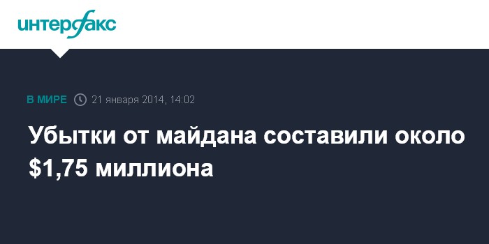 Киев. 21 января. INTERFAX.RU - По оценке киевских властей, убытки от "евромайдана" составили около 14 млн грн ($1/7,99 грн), сообщил исполняющий обязанности главы Киевской городской государственной администрации (КГГА) Анатолий Голубченко.