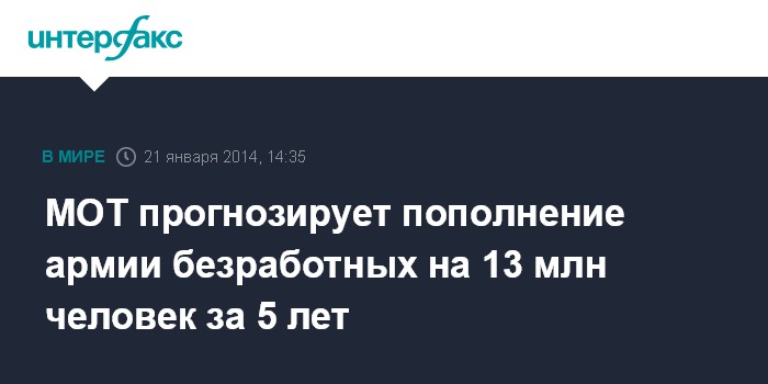 Москва. 21 января. INTERFAX.RU - Вялое восстановление мировой экономики в 2013 году не привело к разрешению кризиса занятости: в прошлом году число безработных в мире выросло на 5 млн человек, говорится в новом докладе Международной организации труда (МОТ) о тенденциях в области занятости.