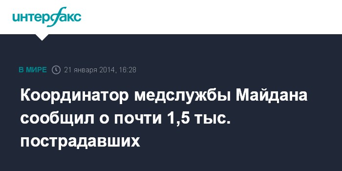 Москва. 21 января. INTERFAX.RU - Почти 1,5 тыс. пострадавших обратились за последние сутки в медицинскую службу штаба национального сопротивления и мобильные бригады медпомощи, сообщает координатор медицинской службы Майдана Олег Мусий.