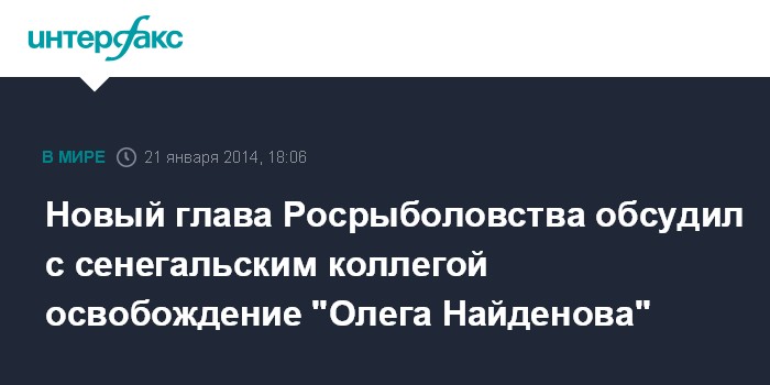 Российское рыболовное судно "Олег Найденов" было задержано военными Сенегала в начале января в Атлантическом океане, в 46 милях от побережья Гвинеи-Бисау. Команда судна состоит из 62 граждан России и 23 - Гвинеи-Бисау. Задержание проводилось без объяснения причин, в грубой форме. Капитан судна Вадим Манторов был закован в наручники.