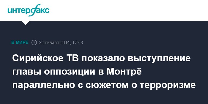 Москва. 22 января. INTERFAX.RU - Государственное телевидение Сирии показало выступление на конференции "Женева-2" главы делегации от оппозиции Ахмада Джербы параллельно с сюжетом о деятельности террористов на сирийской территории.