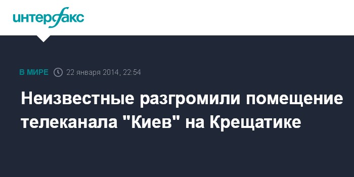 Москва. 22 января. INTERFAX.RU - Неизвестные лица вечером в среду захватили помещение на улице Крещатик, в котором расположен главный офис телеканала "Киев", сообщает пресс-служба городской администрации со ссылкой на сведения сотрудников телекомпании.