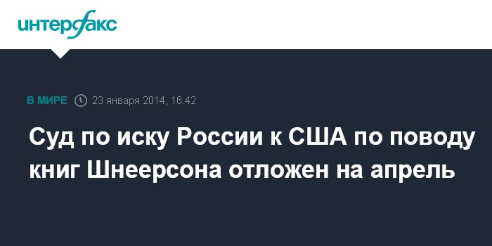 Москва. 23 января. INTERFAX.RU - Арбитражный суд Москвы в четверг перенес предварительные слушания по иску Российской государственной библиотеки и Министерства культуры РФ к Библиотеке Конгресса США по поводу книг из коллекции Шнеерсона на 14 апреля.