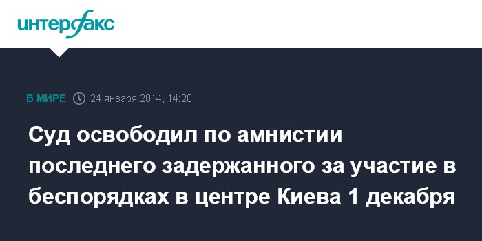 Киев. 24 января. INTERFAX.RU - Последний задержанный за беспорядки на улице Банковой в центре Киева 1 декабря 2013 года, находившийся в следственном изоляторе, Ярослав Притуленко, отпущен на свободу по закону об амнистии. Такое решение принял Шевченковский районный суд Киева в пятницу, сообщил "5 канал".