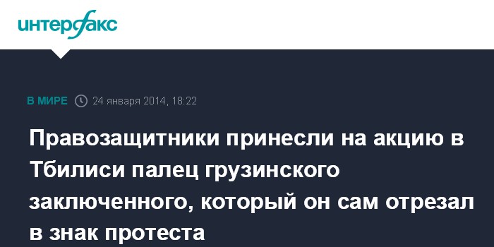 Москва. 24 января. INTERFAX.RU - На акцию перед зданием министерства исполнения наказаний и юридической помощи Грузии в Тбилиси в пятницу ее участники принесли человеческий палец, который, как они утверждают, отрезал себе заключенный, требующий защитить его права.