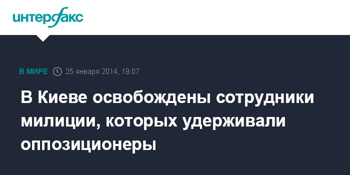 Москва. 25 января. INTERFAX.RU - Двое сотрудников милиции, которые удерживались "охранниками майдана" в здании Киевской горгосадминистрации, освобождены, в настоящее время милиционеры госпитализированы, сообщил министр внутренних дел Виталий Захарченко в субботу.