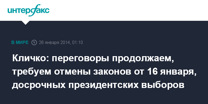 Москва. 26 января. INTERFAX.RU - Лидер украинской оппозиционной партии «УДАР» Виталий Кличко заявляет, что оппозиция продолжает бороться за принятые властью требования протестующих, продолжит переговоры с президентом Украины Виктором Януковичем, но не отступит от своих требований.