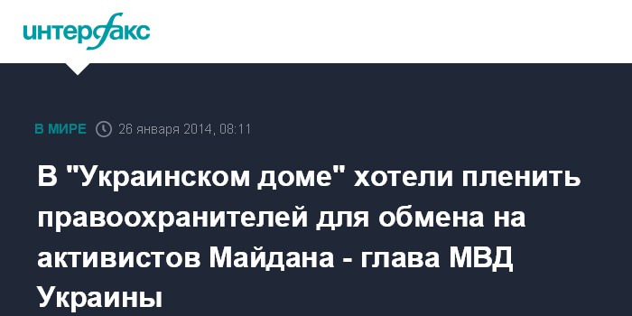 Москва. 26 января. INTERFAX.RU - Министр внутренних дел Украины Виталий Захарченко принял решение вывести группу резерва правоохранителей, которые отдыхали в "Украинском доме" в центре Киева, из помещения, чтобы не препятствовать переговорному процессу и урегулировать ситуацию мирным путем.