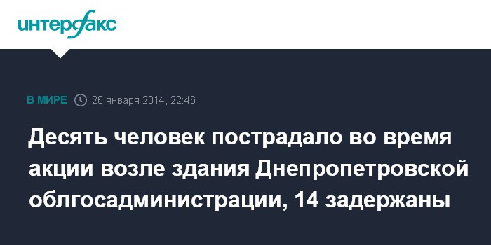 Днепропетровск. 26 января. ИНТЕРФАКС-УКРАИНА - В результате противостояния участников "народного вече", милиции и "титушек" у стен Днепропетровской облгосадминистрации в воскресенье пострадало 10 человек.