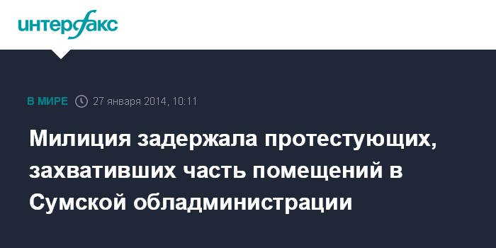 Киев. 27 января. INTERFAX.RU - Силового разгона протестующих, которые захватили крыло административного здания Сумской облгосадминистрации, не было, однако есть задержанные, сообщает сектор связей с общественностью УМВД Украины в Сумской области.