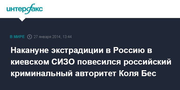 Москва. 27 января. INTERFAX.RU - В Лукьяновском СИЗО в Киеве был найден повешенным российский промышленник и криминальный авторитет Николай Кравченко, известный в уголовной среде как Коля Бес, сообщили агентству "Интерфакс" источники в Государственной пенитенциарной службе Украины (ГПтС).