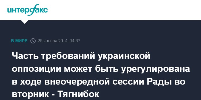 Часть требований украинской оппозиции может быть урегулирована в ходе внеочередной сессии Рады во вторник - Тягнибок