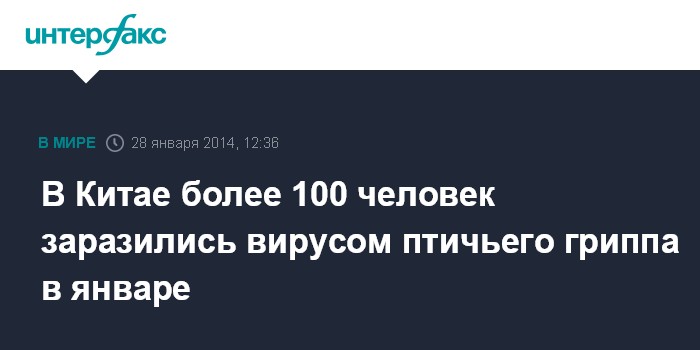 Москва. 28 января. INTERFAX.RU - За январь 2014 года в Китае выявлено 102 случая заболевания людей птичьим гриппом (вирус H7N9), сообщают во вторник западные СМИ.