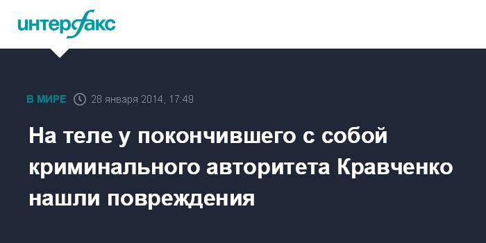 Москва. 28 января. INTERFAX.RU - Криминалисты зафиксировали повреждения на теле покончившего с собой в киевском СИЗО криминального авторитета Николая Кравченко, сообщает пресс-служба СКР Новгородской области.