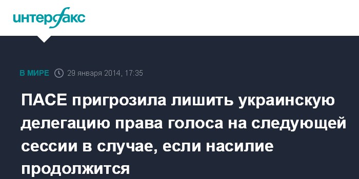 Брюссель. 29 января. INTERFAX.RU - Мониторинговый комитет ПАСЕ подготовил проект резолюции по ситуации в Украине, в которой выразил обеспокоенность в связи с насилием с обеих сторон конфликта, призвал к диалогу для мирного урегулирования и пригрозил лишить права голоса украинскую делегацию на следующей сессии в случае продолжения насилия.