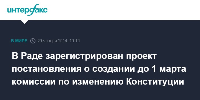 Как рассказал журналистам внефракционный народный депутат Сергей Мищенко, проект постановления о создании специальной комиссии Верховной Рады по вопросам подготовки и согласованию законопроекта о внесении изменений в Конституцию Украины по возвращению к парламентско-президентской форме правления предполагает, что соответствующая комиссия будет создана до 1 марта 2014 года и должна работать над подготовкой изменений к Основному закону до 1 октября 2014 года.