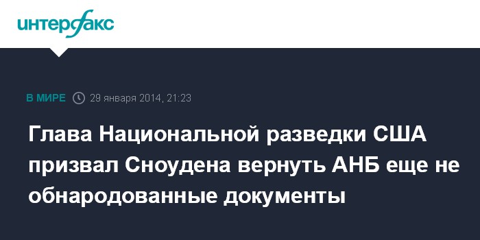 Москва. 29 января. INTERFAX.RU - Глава американской национальной разведки Джеймс Клеппер в среду призвал экс-сотрудника ЦРУ Эдварда Сноудена вернуть Агентству национальной безопасности (АНБ) все оставшиеся у него секретные документы и не публиковать их, сообщает Associated Press.