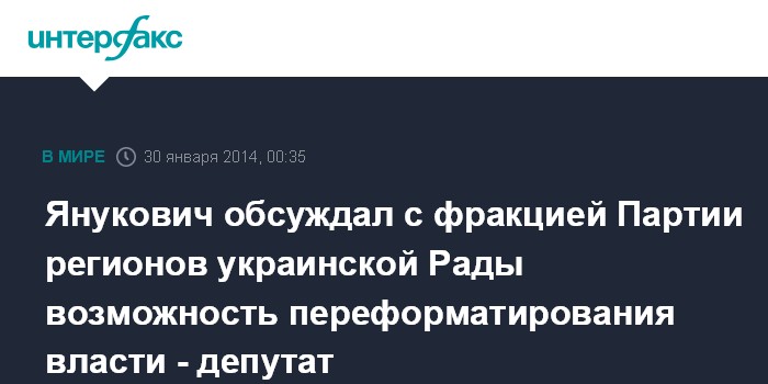 Москва. 30 января. INTERFAX.RU - Президент Украины Виктор Янукович может сделать заявление о переформатировании власти - такой вариант глава государства озвучил на совещании с фракцией Партии регионов, сообщил депутат фракции Владимир Олейник.
